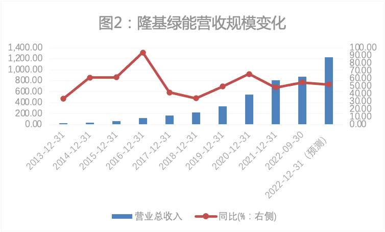 2022年前三季度,隆基绿能实现营收870.4亿元,同比增长55%。Wind显示,机构预测隆基绿能2022年全年营收或达到1230亿元,同比增长五成以上。