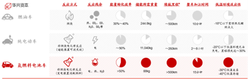 交通领域,氢燃料电池车是目前氢能最为主流的应用。与燃油车相比,氢燃料电池能量转化效率高,运行中零排放,为交通场景提供了重要的减排方案。而与其他新能源车相比,氢的热值高,因此氢燃料电池较锂电池重量轻,同时氢燃料电池续航里程更长、加注时间更短,没有电动车的里程焦虑,用于长途重卡能发挥显著优势。