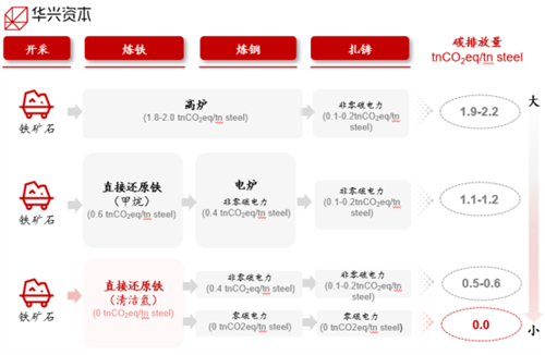 除此之外,清洁氢还能代替化石能源作为还原剂助力原本难以降碳的石化、钢铁等行业深度脱碳。以钢铁行业为例,目前全球大部分的钢铁使用传统的高炉工艺,即通过焦炭对铁矿石进行还原,生产过程中将产生大量的二氧化碳排放,但如果使用直接还原铁工艺(DRI)+电炉作为高炉炼钢的替代方案,利用氢气替代焦炭,钢铁生产过程中的碳排放将大大降低,在理想的绿电+清洁氢的情况下,甚至可以达到零碳排。