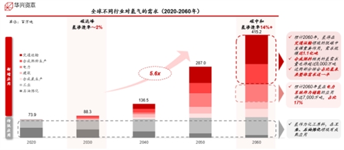 碳中和大背景下,能源的清洁性愈发重要,氢在可再生能源对化石能源的替代过程中将起到必要的辅助与补充作用,预计2060年全球氢气需求规模将达约4.2亿万吨;