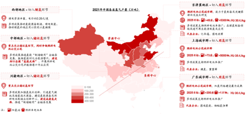 基于政策规划、资源禀赋、下游消纳能力等因素的差异,我国各氢能产业集群的侧重点也不尽相同,各地方给予制氢、整车、加氢、核心零部件等环节不同程度的补贴,进而降低氢在不同环节的成本,有针对性地吸引更多企业入场,我国的氢能产业发展也因此显现出区域性特征。以集群内的产业发展为锚点,未来各集群之间的相互配合将构建全国性的规模化氢能网络。