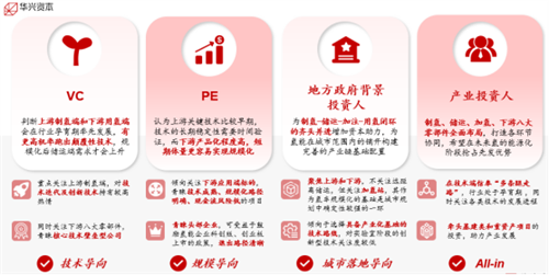 不同类型的投资机构策略不尽相同,VC更关注潜在的颠覆性技术,PE倾向以规模为导向选择标的,地方政府背景投资人因地制宜,投资主要以城市落地为主,产业方则采取“All-in”策略,针对“制储运加用”各环节广泛覆盖不同的技术路线,“多条腿走路”以保证占据一定先发优势