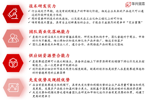 综合来看,氢能可以类比制造业,供应链资源整合和降本能力是目前已经步入产业化阶段的技术路线的相关企业的核心竞争力。同时,因为赛道尚处于早期阶段,技术研发能力和商业化进程是投资人重点考量的因素。