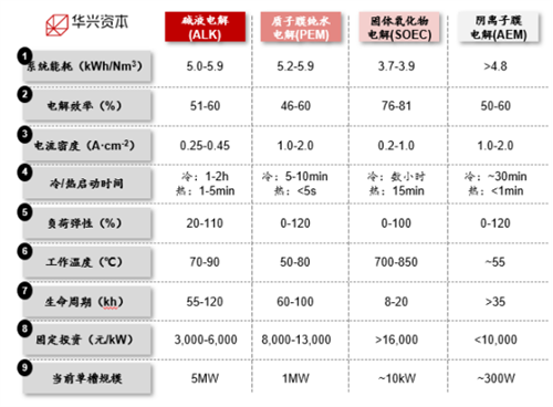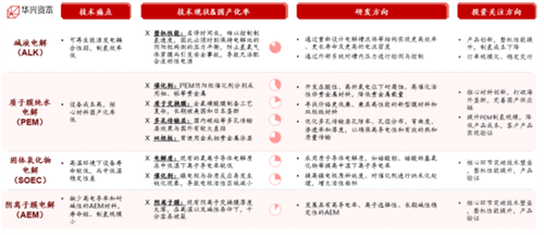 其他的技术路线仍在实验室阶段,尚需资本投入和研发沉淀,比如固体氧化物电解(SOEC)虽然效率高,热机状态动载性能好,但需要高温热源,且设备投资大、寿命短,从实验室转向产业化应用仍需跨越较多挑战,阴离子膜电解(AEM)采用非贵催化剂和高性能阴离子膜,兼具低成本、高电流密度、高电耦合性等优势,但大面积阴离子膜的研制还需要较长周期。
