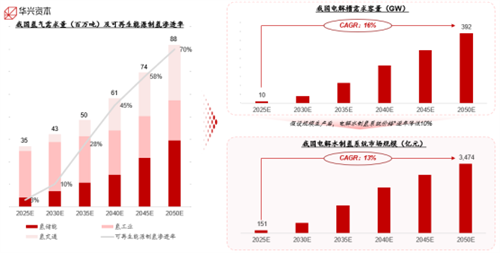 随着成本下降,绿氢渗透率将持续上升,预计2050年我国可再生能源制氢供给超6,000万吨,对应电解槽容量约400GW,市场规模至少3,500亿元。