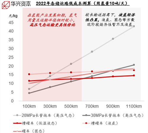 除了技术本身以及产业化进程层面的差异,不同输送距离下各储运方案也呈现出明显的经济性差异,比如在500km以内的短距离运输场景中高压气态的方案最为经济,且随着压力的提升,效率变高的同时成本也越低,而大于500km的中长距离,高压气态的成本将大幅上升,液氢则成本更低。因此,未来基于技术突破、规模化应用,短距离高压气态储运有望持续降本,远距离输送方案亦将具备经济性,构建千亿级氢能储运市场。同时,如何配合氢能整体产业链的规模化发展进程及时有效地发展不同的氢储运技术路线也是目前全产业面临的挑战。