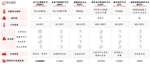 燃料电池系统是最靠近终端的产品,目前已在多个示范集群形成区域头部集团,关注头部企业的放量和盈利情况,关注成长中企业的产品性价比差异及应用场景差异。我国重点发展PEMFC和SOFC电池,PEMFC具有功率密度大、可低温快速启动、体积小重量轻、寿命长的优势,且对氧化剂要求低,空气即可作为氧化剂,是目前技术最成熟、装机量最大的燃料电池路线,而SOFC则在商业化初期,有机会诞生新的行业龙头公司。