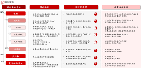 以PEMFC为例,目前系统整体以及电堆的降本增效、核心零部件的材料和工艺体系创新是值得关注的重点。尤其是膜电极中催化剂、质子交换膜和气体扩散层的国产替代率仍然较低,是短期国内企业需要攻关的主要方向。