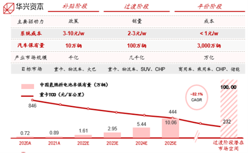 以规模效益、国产化、技术进步等因素带来的成本下降为抓手,未来氢燃料电池车的保有量将快速上升,预计系统成本降低到2~3元/w时氢燃料电池车的保有量可以突破100万辆,对应千亿乃至万亿的市场规模。