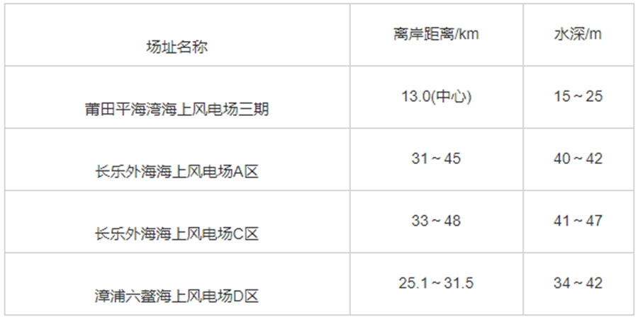在“碳中和”目标下,海上风电发展迅猛,近海的海上风电场日渐饱和,开发规模受限。此外,由于80%的海上风能处于深远海,为尽量减少对周边环境功能、活动和基础设施网络的影响并充分利用海上风能,海上风电场正逐步由潮间带向深远海发展,建设项目的离岸距离和水深不断增加。飘浮充电是深远海风电机组发展的主力,关系大型风电飘浮式机组和海上智慧运行。2018年福建核准的海上风电场有4个满足“双十”标准,即离岸距离不少于10 km、滩涂宽度超过10 km时水深不少于10 m(表1)。