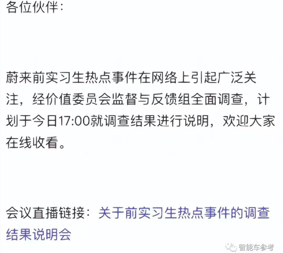 8、通报结束后,蔚来价值委员会宣布成立反性骚扰小组,引入了外部律师事务所来接受员工投诉。最后HR负责人做了检讨,宣布了下一步HR价值观和能力提升计划,以及对实习生关爱、能力提升、管理等方面的措施。