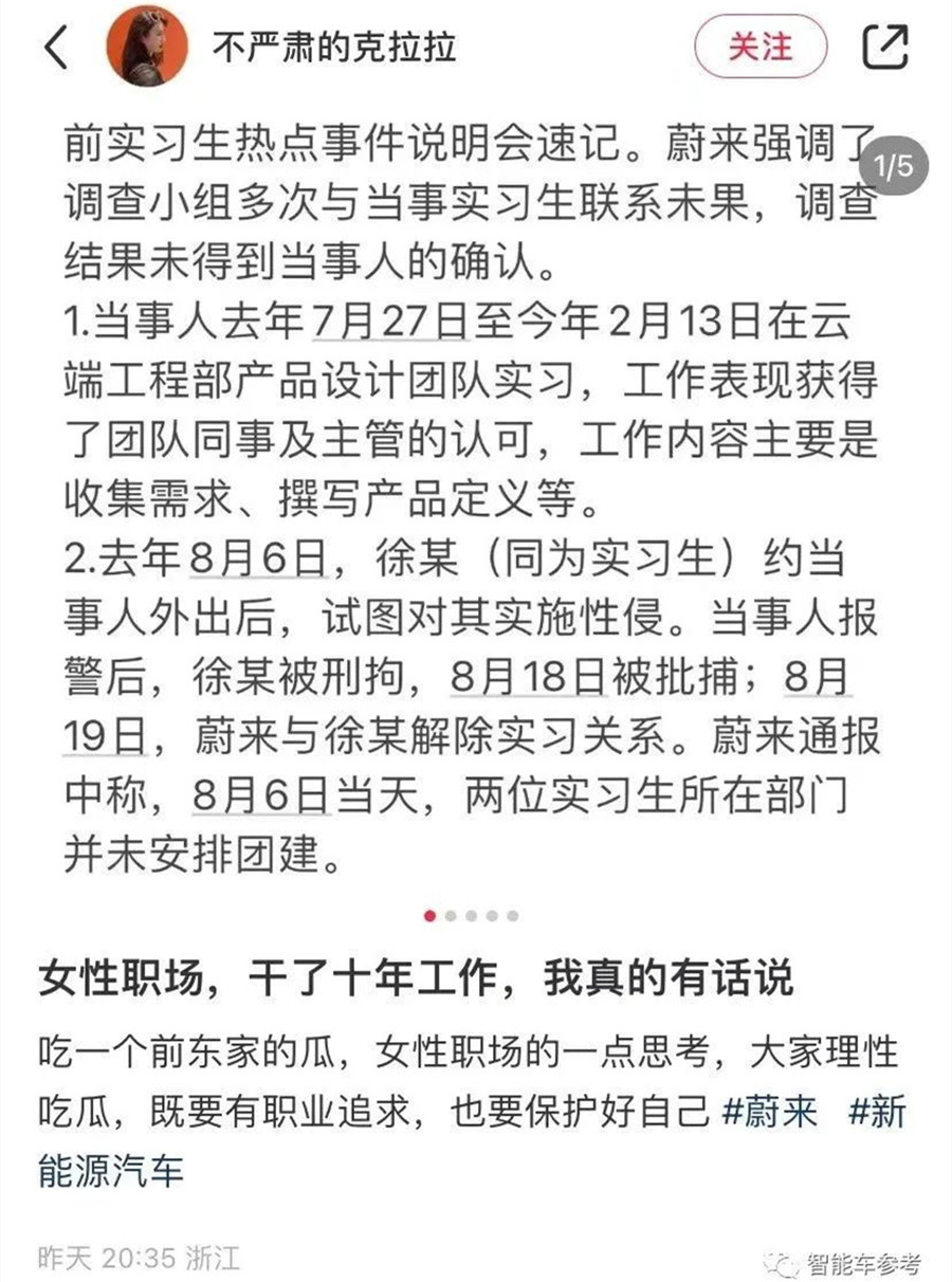 2、去年8月6日,徐某(同为实习生)约当事人外出后,试图对其实施性侵。当事人报警后,徐某被刑拘,8月18日被批捕;8月19日,蔚来与徐某解除实习关系。8月6日当天,两位实习生所在部门并未安排团建。