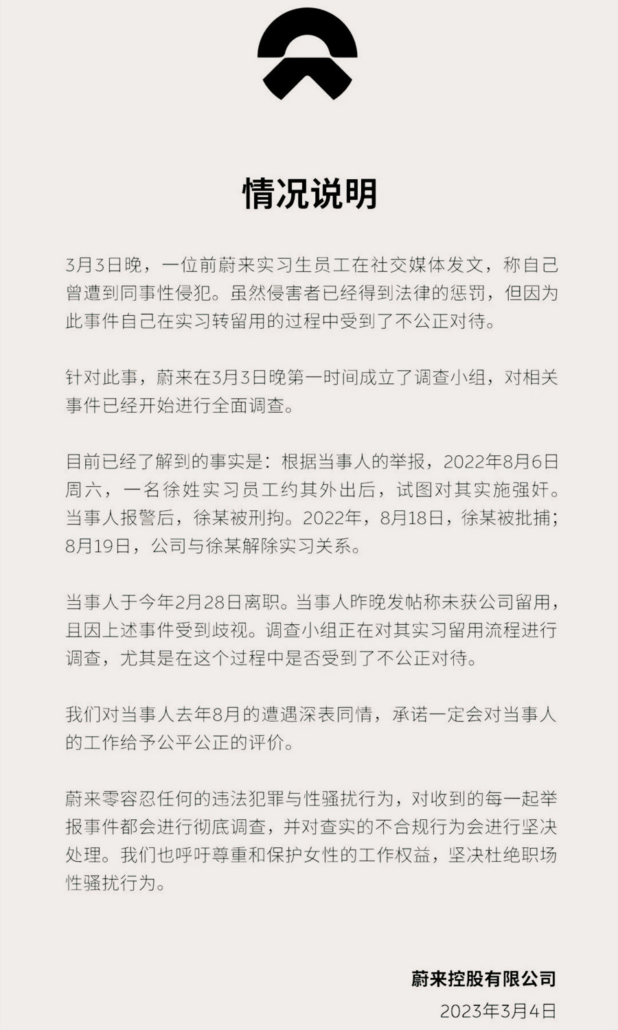 针对上述事件,蔚来在3月4日发布了以下说明:
