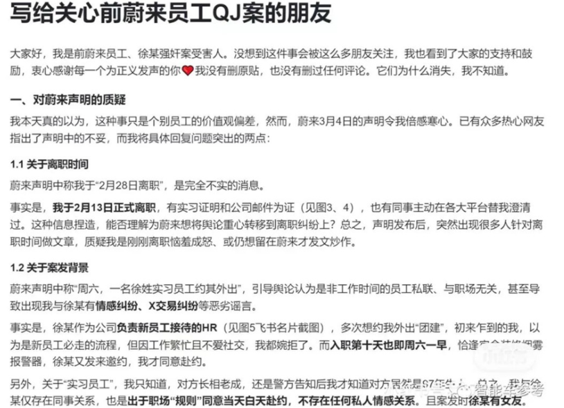 首先,当事人对蔚来的说明提出了两点质疑,主要关于离职时间和案发背景。
