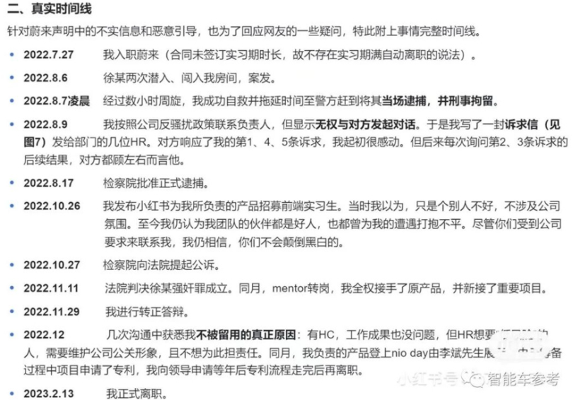 3、关于事发第一时间没内部通报,此时这一侵害事件尚未获得司法定论,蔚来合规委员会因此决定暂不对是否内部通报下结论。2022年11月21日,当事人告知HR,侵害者已被判刑,双方可以就内部通报一事进行讨论。经调查确认,HR并未就此事进行跟进,且没有给当事人反馈。