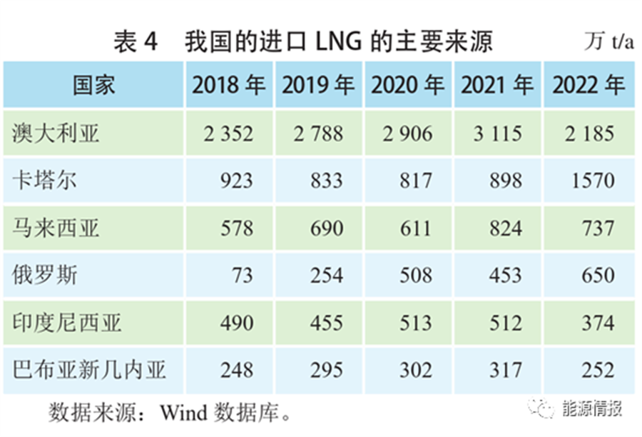 得益于中卡能源合作的良好政治基础,LNG已成为是两国经贸合作重点领域。2022年我国从卡塔尔进口1570万tLNG,卡塔尔成为我国第二大LNG进口来源国,仅次于澳大利亚(见表4)。