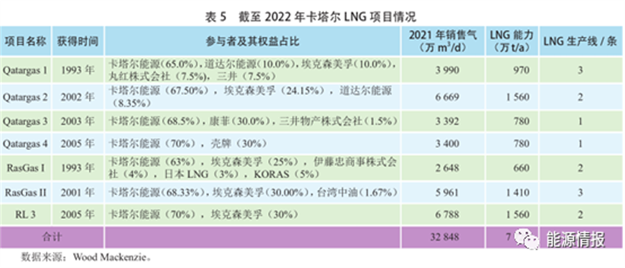 2017年4月,卡塔尔首先提出北部气田东部项目,2021年完成最终投资决策。该项目计划新建4条LNG生产线,每条生产线产能为800万t/a,建成后卡塔尔LNG产能提升至1.10亿t/a,加上其参股的美国德州GoldenPassLNG项目的1500万t/a产能,合计拥有约1.25亿t/a的LNG能力。埃克森美孚、壳牌、道达尔能源、埃尼、康菲等国际石油巨头已签约进入该项目,合计拥有北部气田东部项目25%权益。2022年11月21日,中国石化宣布与卡塔尔能源公司签署为期27年、400万t/a的LNG长期购销协议,同时也获得了参与上游勘探开发投资合作的机会。