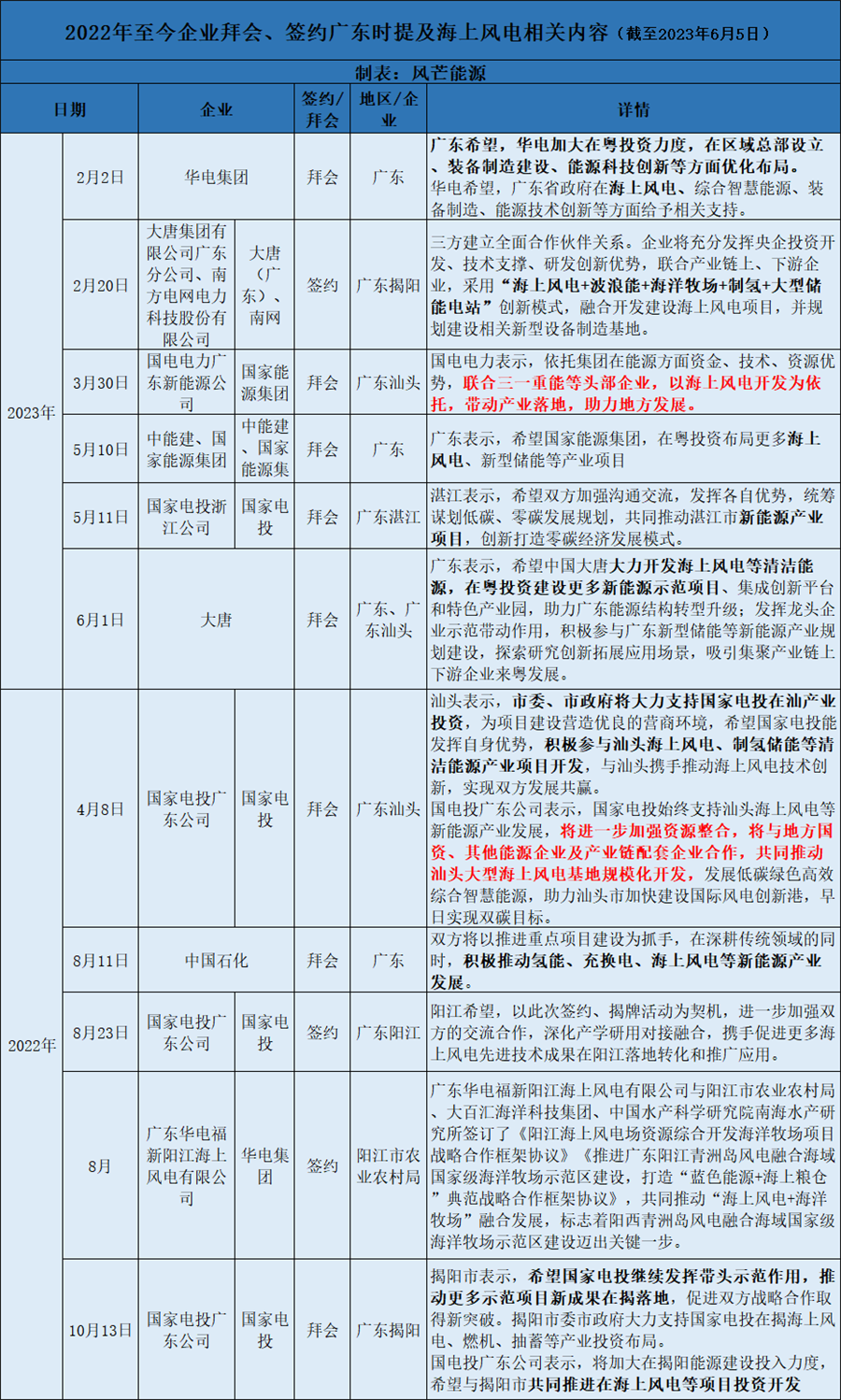 除了集团领导拜访外,当地下属分公司也能接上不断“使劲”,拜访、签约不断。特别是国电电力广东新能源公司,在今年3月拜会广东汕头时表示,将依托集团在能源方面资金、技术、资源优势,联合三一重能等头部企业,以海上风电开发为依托,带动产业落地。从该表态来看,如果双方工作推进顺利,企业在广东海上风电项目上,分一杯羹应有一定优势。