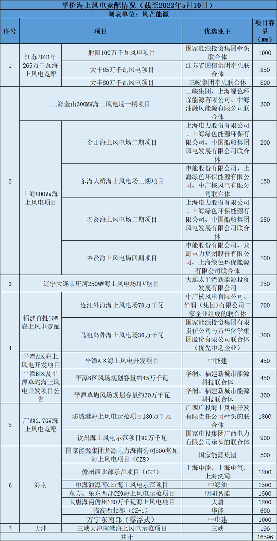 风芒能源根据公开信息不完全统计,自海上风电平价以来,我国已有7省共计启动16.7GW海上风电竞配。在优选业主中,联合体中标已为常态。当地国企中标“分羹”情况屡见不鲜。