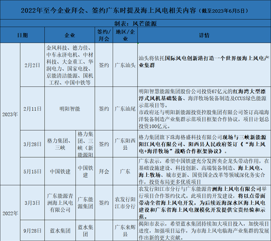 从签约会见情况来看,中国石化集团、华电集团、国家能源集团、大唐集团在本轮海上风电项目竞争中,与地方政府互动频繁,最有希望拿下项目。风芒能源根据公开信息不完全统计,2022年以来,上述集团领导纷纷带队拜访广东省政府,围绕海上风电等领域共谋发展。集团领导带队时,广东省政府都表示,希望企业加大在粤投资力度,布局更多海上风电项目。