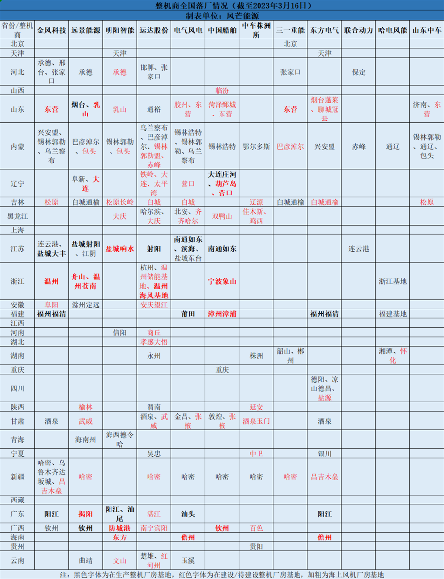 风芒能源根据公开信息不完全统计,截至2023年3月,金风科技、远景能源、明阳智能、运达股份、电气风电、东方电气等整机商落厂广东。也就是说,在广东,不管是与开发商联合参与项目竞配,还是风机销售,这些整机商都具有一定优势。特别是明阳智能,总部位于广东中山,极具主场优势。