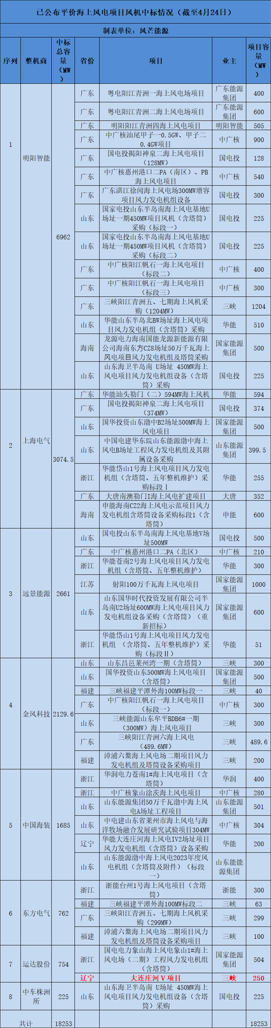 在风芒能源本次梳理表可以看到,2022年以来,除了央企及下属单位外,广东能源集团,格力集团等也与当地政府在海上风电上也有签约。作为当地企业,在本轮竞配时,也有望获取一定项目。