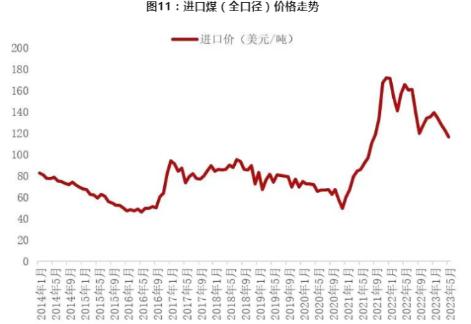 进出口方面,进口煤的年内价格也持续下滑,2023年1至5月全口径煤炭进口均价录得127美元/吨,较去年均价降12.04%(对应降幅17美元/吨)。其中2023年5月进口煤价格录得117美元/吨,同比降29.57%,环比降5.06%。