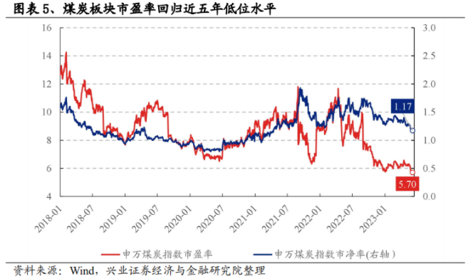 从估值的角度来看,截至2023年6月15日,煤炭板块市盈率为5.70倍,估值分位数为0.6%,处于近5年低位水平,市净率为1.17倍,估值分位数为50.8%,处于近5年中等水平。