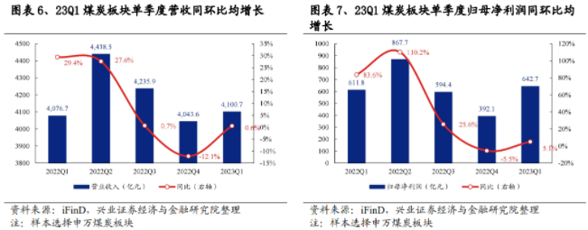 但另一方面,在煤价下行的大环境下,板块的营收和归母净利润环比却均实现增长。2023一季度,煤炭板块实现营收4100.7亿元,同比增长0.6%,环比增长1.4%,实现归母净利润642.7亿元,同比增长5.1%,环比增长63.9%。
