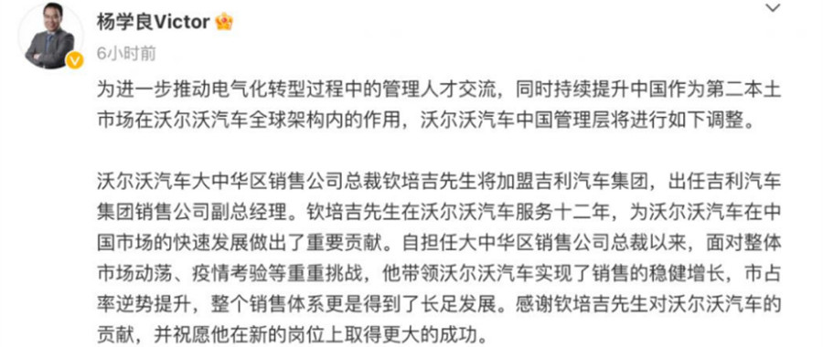 而就在该公告发布前三天,沃尔沃汽车发布的一封内部信显示,钦培吉将卸任沃尔沃汽车大中华区销售公司总裁,由沃尔沃汽车日本总经理潘鹤松接任。对于钦培吉的去向,沃尔沃汽车方面仅表示“寻求外部发展”。