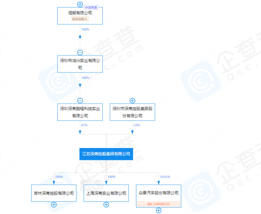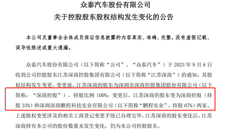 众泰汽车9月6日晚间公告,公司控股股东江苏深商控股集团有限公司(以下简称“江苏深商”)的股权结构近期发生变更,深圳深商鹏程科技实业有限公司(简称“鹏程实业”)成为持有江苏深商67%股份的大股东。江苏深商原本由深圳市深商控股集团股份有限公司(简称“深商控股”)全资所有,如今深商控股持股比例降至33%。