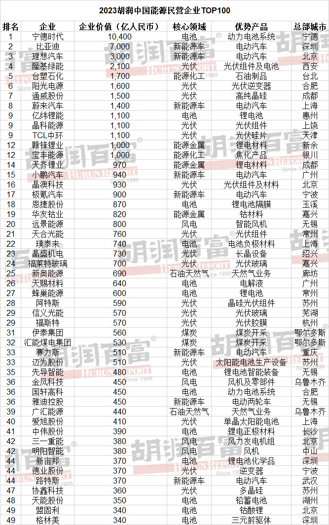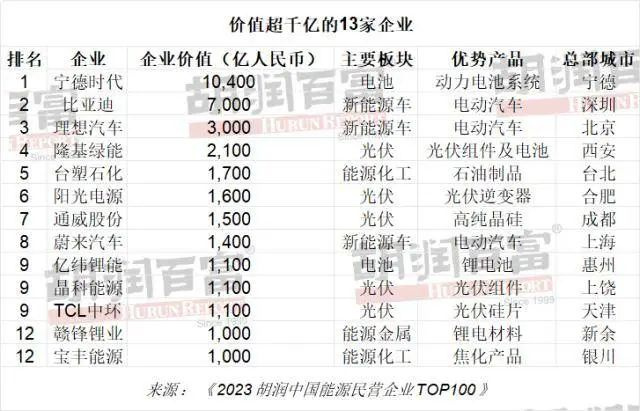 9月7日,胡润研究院发布《2023胡润中国能源民营企业TOP100》,宁德时代、比亚迪、理想汽车位居前三,榜单前十的企业中有五家光伏企业,分别是隆基绿能、阳光电源、通威股份、晶科能源、TCL中环。这是胡润研究院首次发布上述榜单,列出了传统能源与新能源产业最具价值的中国民营企业100强。榜单所指的“中国民营企业”,是总部在中国的非国有企业。