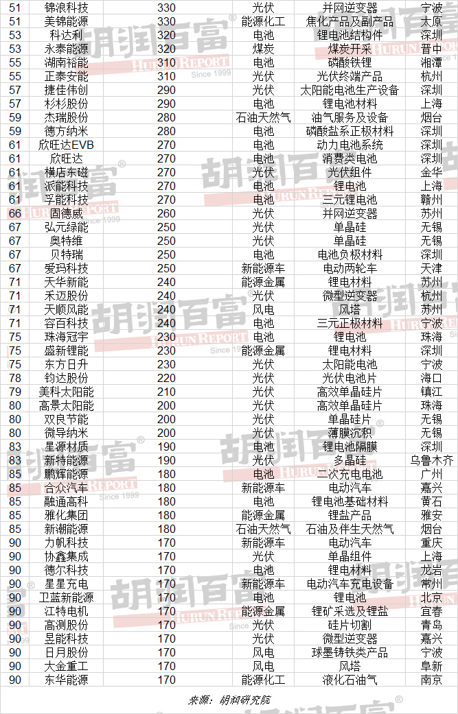 榜单中,光伏产业、电池产业和新能源车产业分别有34家、29家和12家企业上榜,分列榜单前三名。风电产业和能源金属各有7家;能源化工和石油天然气各有4家;煤炭行业3家。