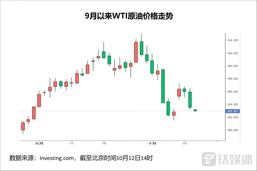 就在这个档口,巴以冲突爆发并持续升级,国际油价10月9日出现大涨,布伦特原油期货主力合约报收88.15美元/桶,单日上涨4.22%,美国WTI原油期货主力合约也大涨4.34%。但随后两日,国际油价迅速回落,布伦特降至86美元/桶以下,WTI降至84美元/桶以下。