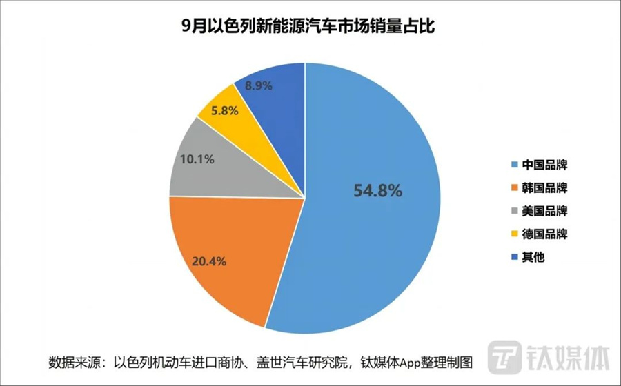 新能源汽车方面,以色列是中国车企新势力出海的重要阵地之一,2022年,中国品牌销量占到以色列全年纯电车销量的一半之多,吉利、比亚迪更是其中翘楚;今年9月,我国产品在当地新能源汽车市场份额占比约55%,比亚迪更是拿下了新能源汽车销量第一和单一车型销量第一的双料冠军。