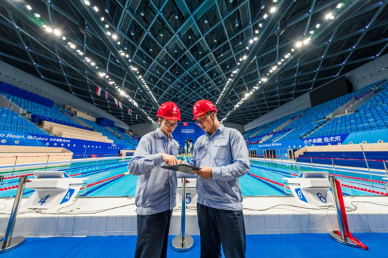 在杭州奥体中心游泳馆,国网浙江电力保障团队开展电力巡视,查治设备隐患,全力保障亚运会保电万无一失。丁豪 摄